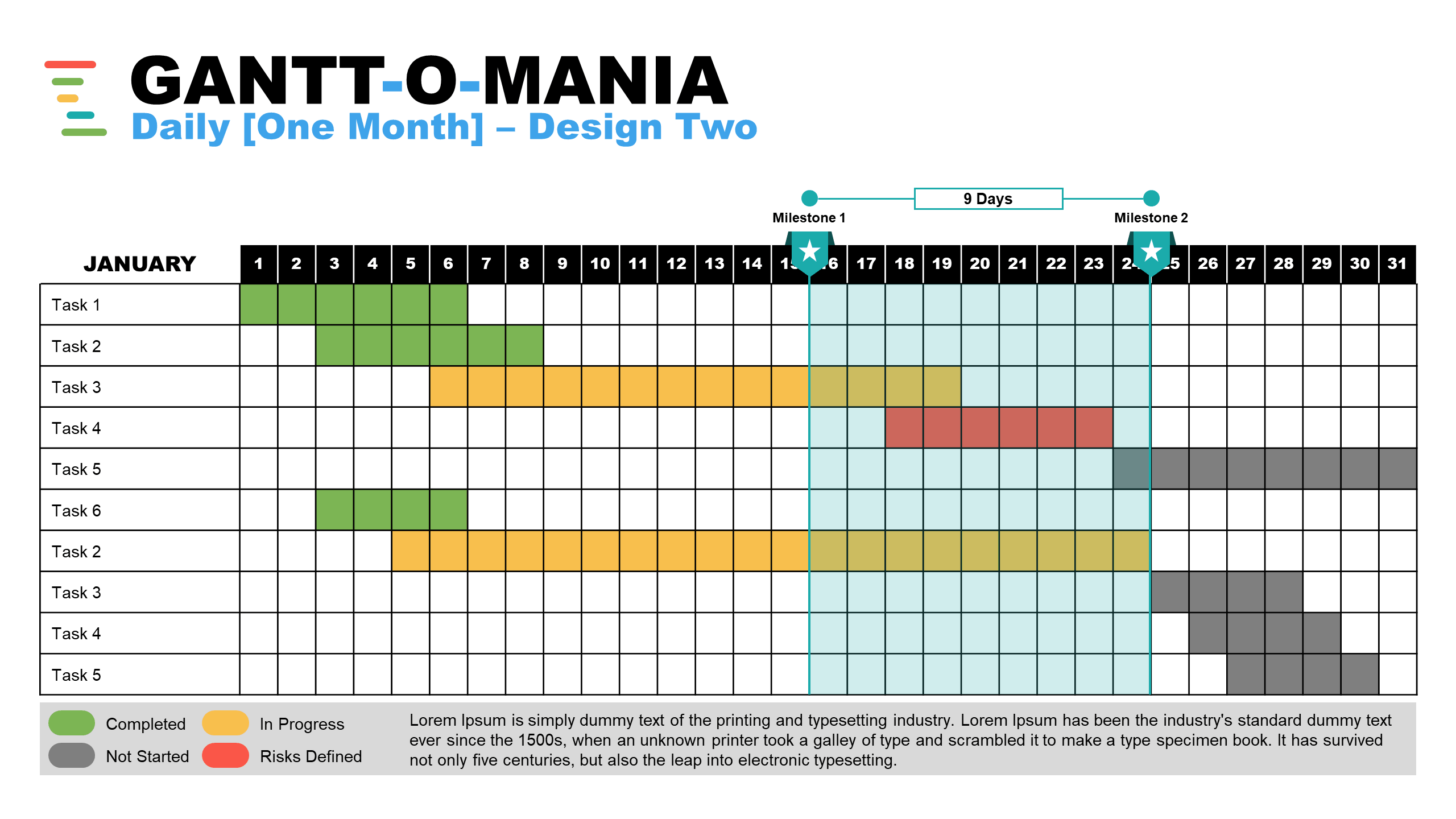 Each slide in Gantt-O-Mania has a different take on how a beautiful Gantt chart can look like. Simplicity is key here: we designed every slide to allow you to easily edit anything you want.