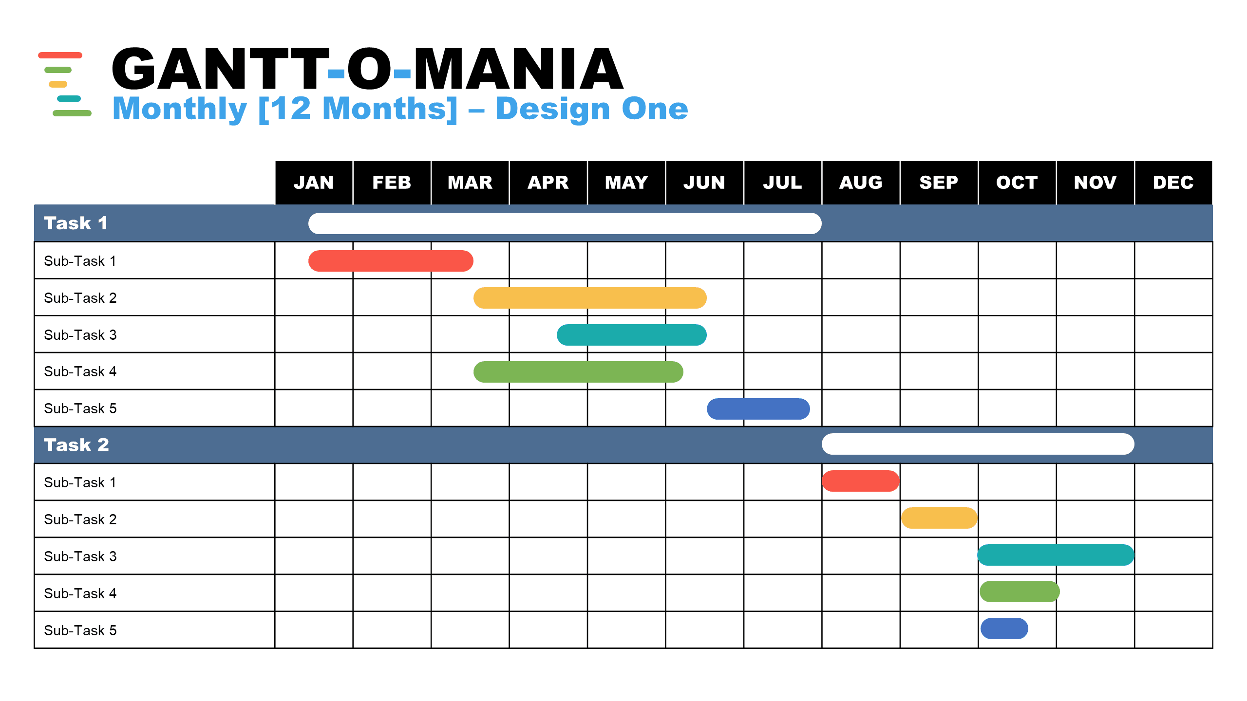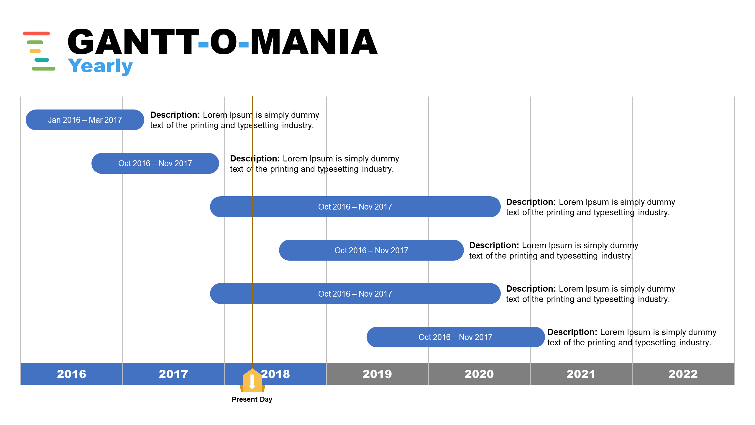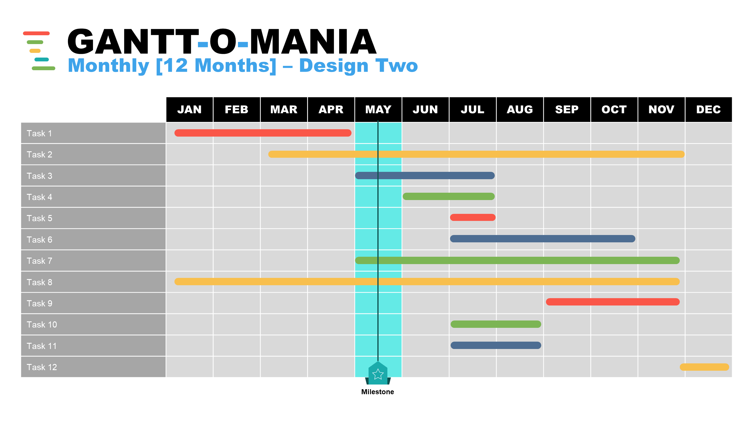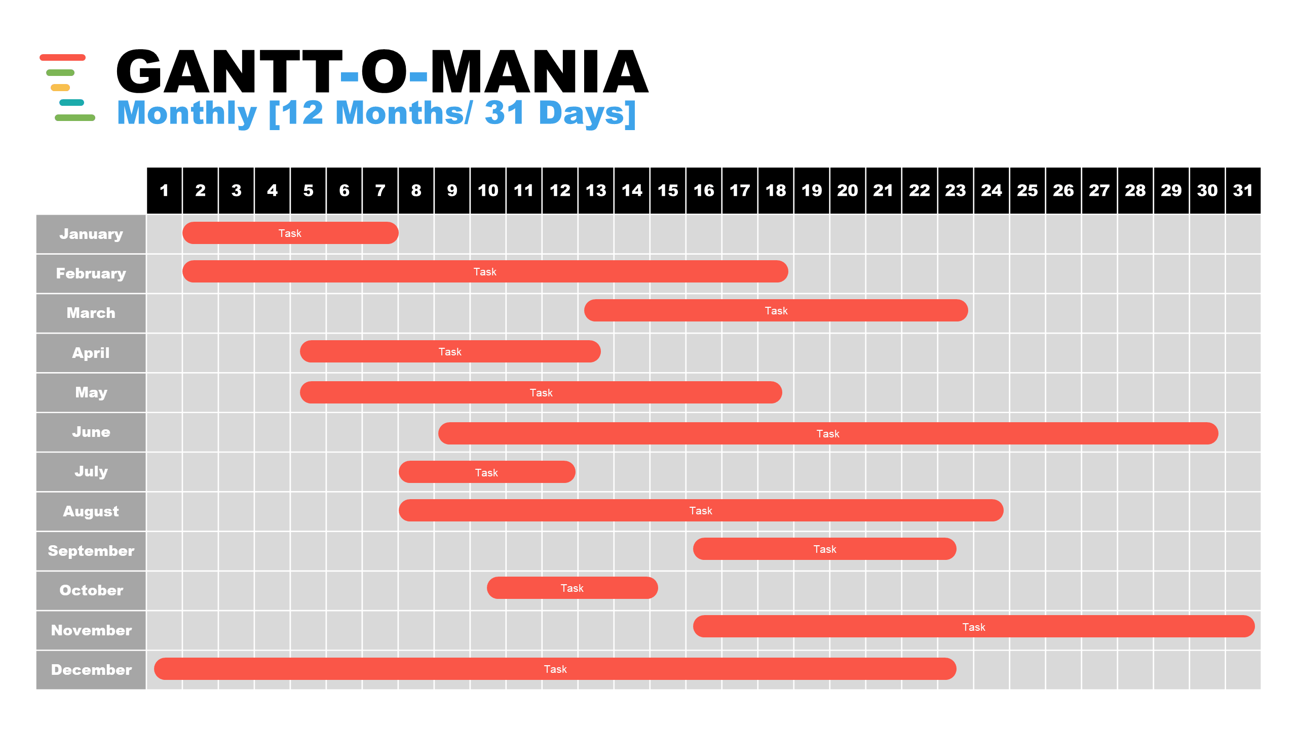 Gantt-O-Mania is a PowerPoint template dedicated to all of you project management professionals out there. It consists of 16 Gantt chart slide templates with the following timelines to keep you and your team organized: