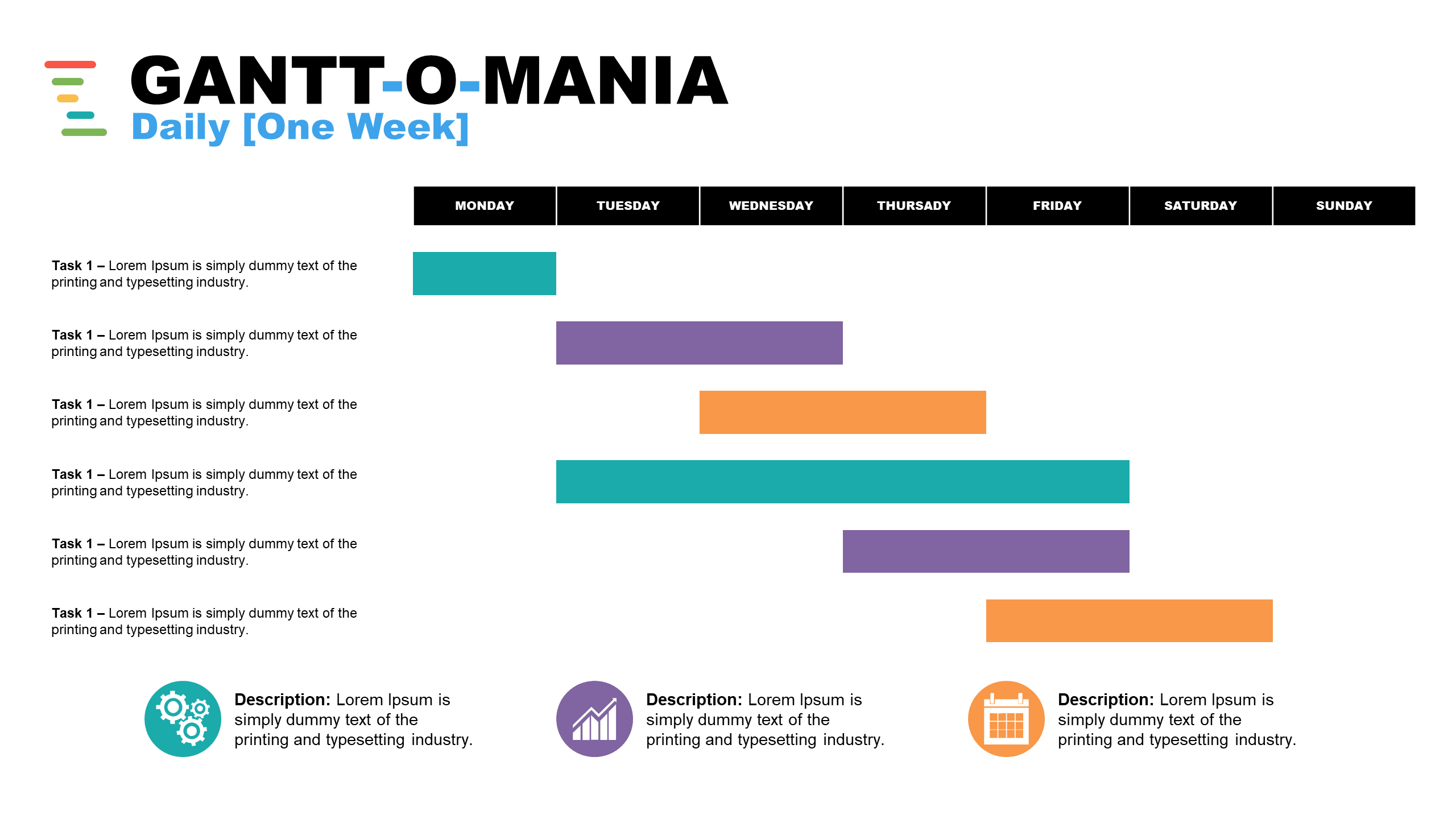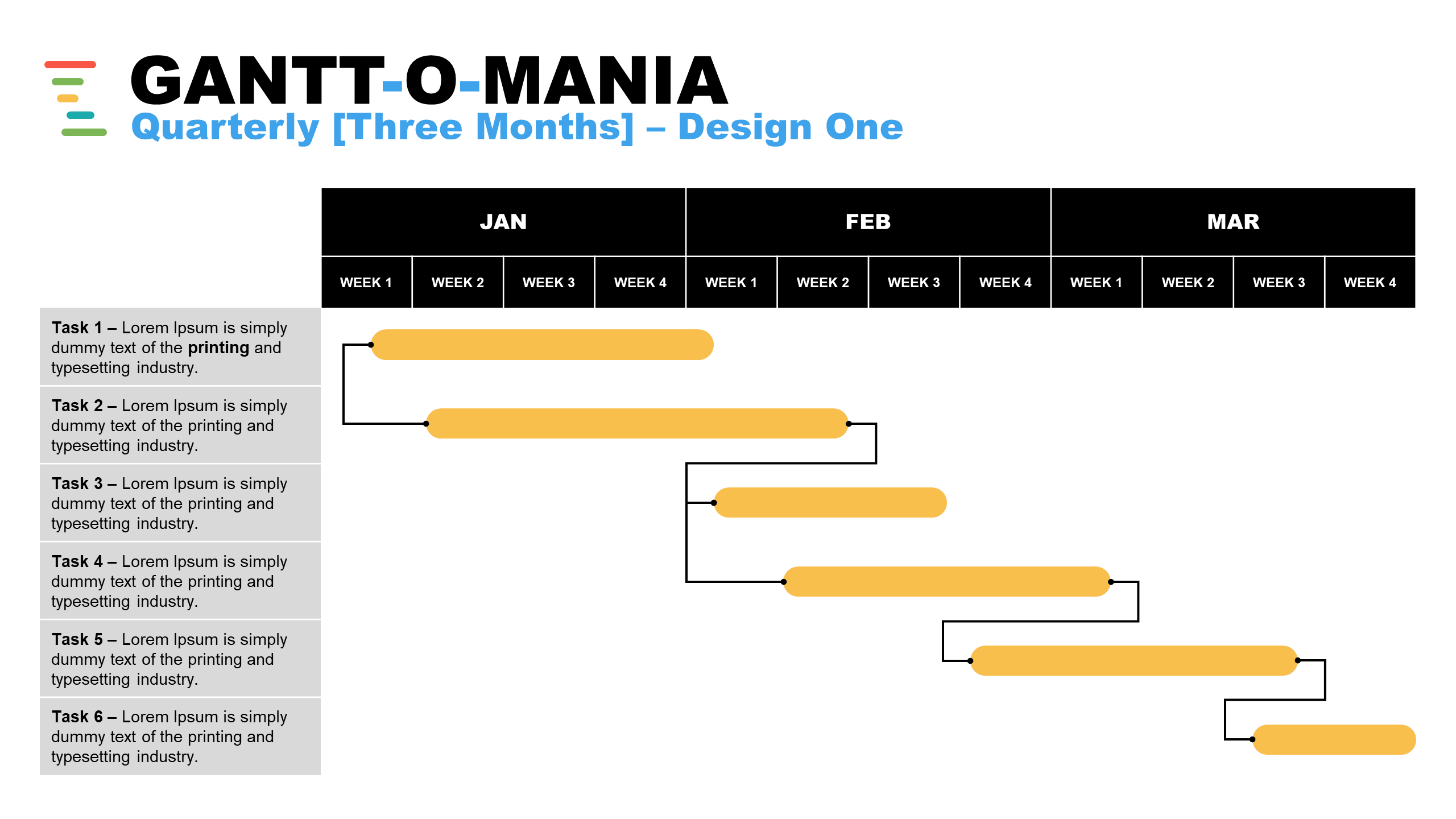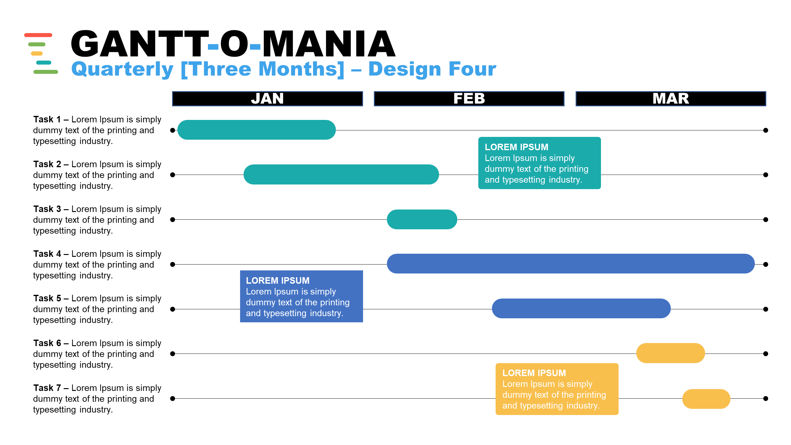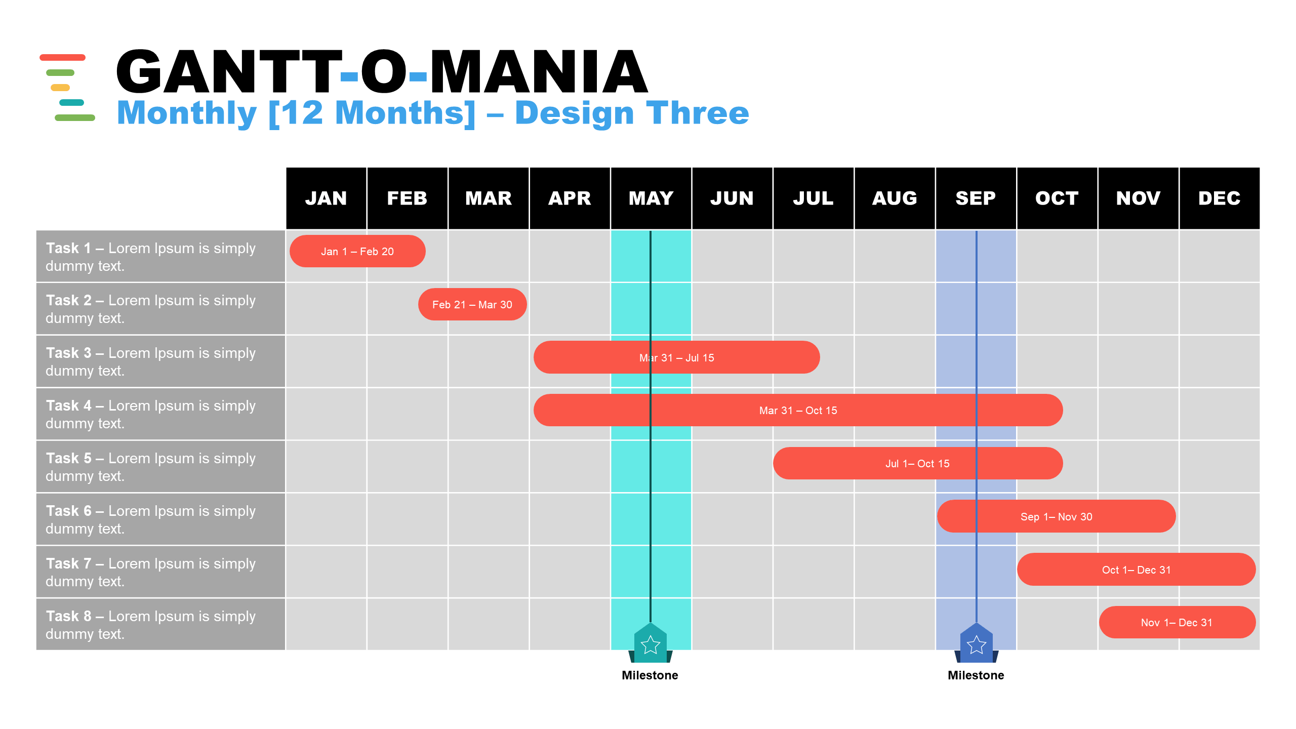 Gantt-O-Mania is a PowerPoint template dedicated to all of you project management professionals out there. It consists of 16 Gantt chart slide templates with the following timelines to keep you and your team organized:
